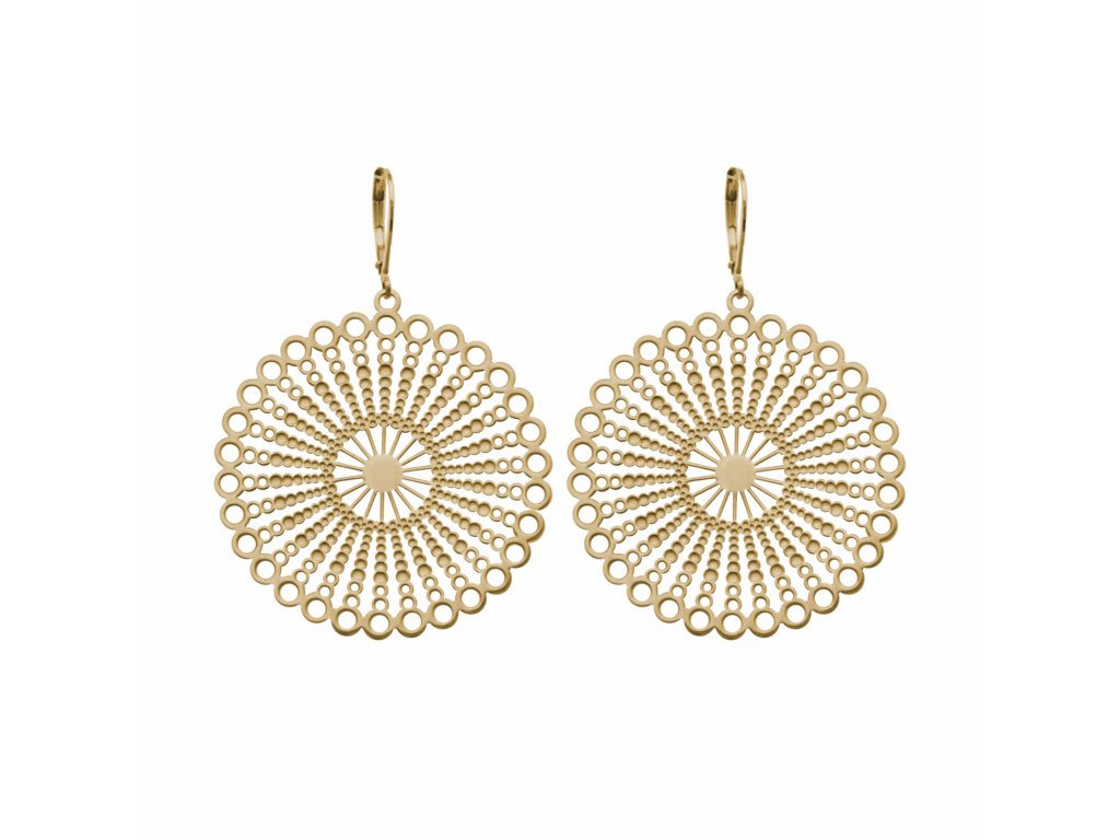 Zlaté ocelové náušnice klapky s filigránovým sluncem bez krystalů