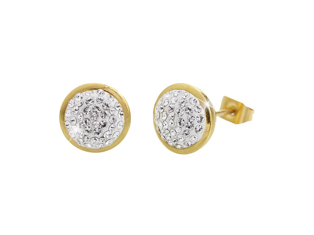 Zlaté ocelové náušnice puzety kulaté lůžko drobně osázené krystaly Swarovski Crystal
