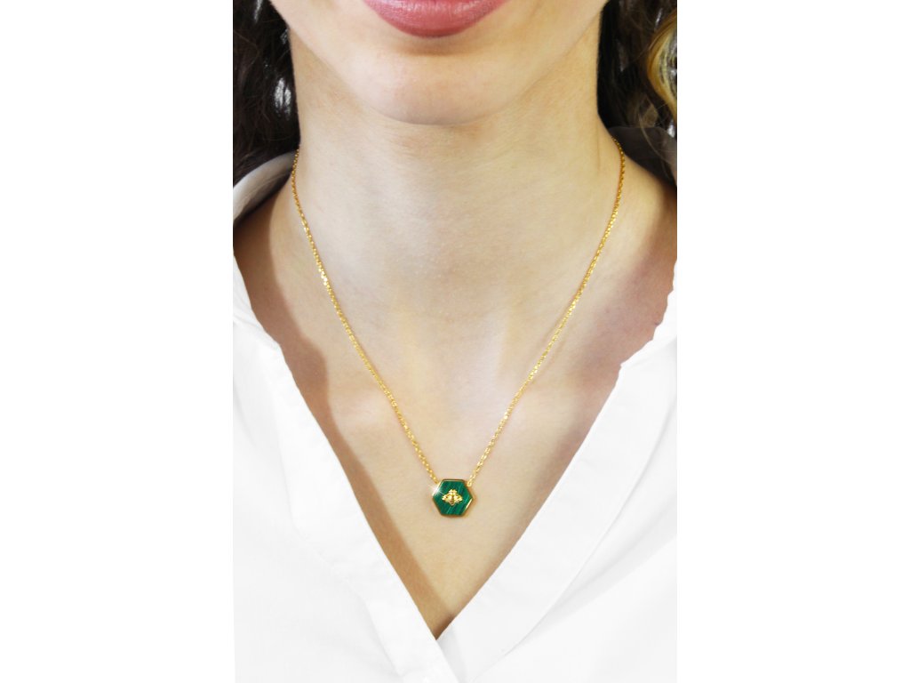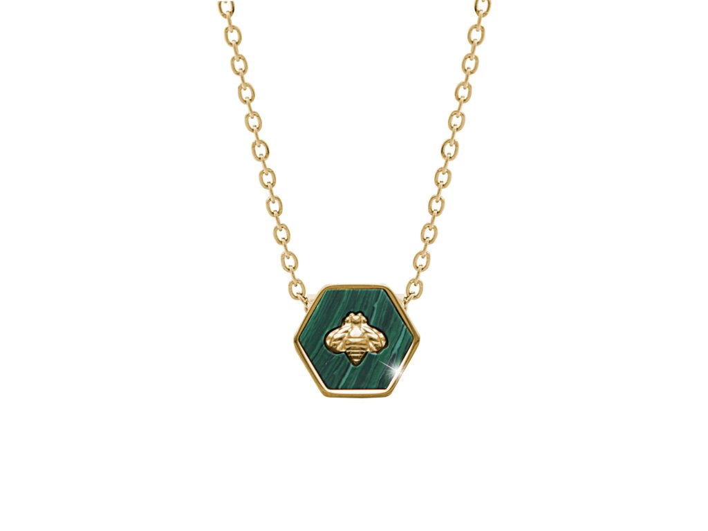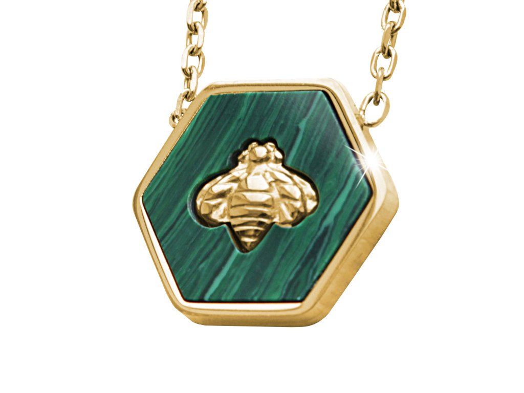 Zlatý ocelový náhrdelník plástev s včelkou a pravým kamenem Green